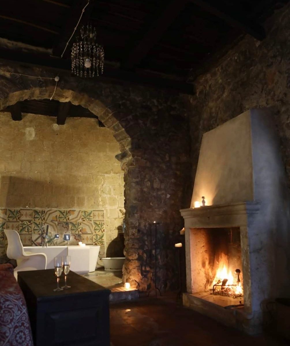 La suite è uno splendido appartamento di 60 mq, con mura in pietra e soffitti con travi in legno. L’appartamento si dispone di zona relax, una camera separata con due letti singoli ed un living con il letto matrimoniale, camino in pietra, vasca a vista e stanza da bagno.